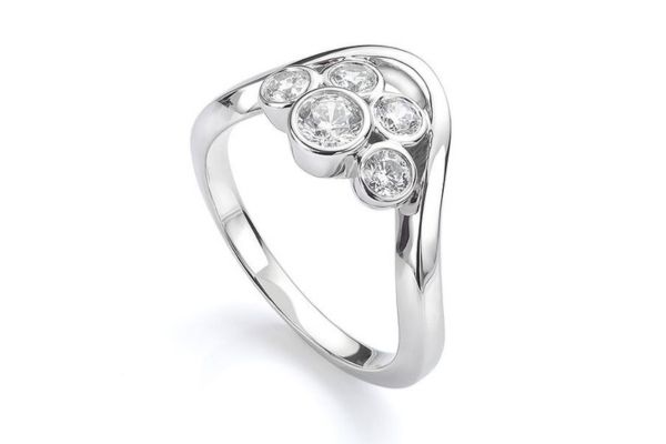 This modern five-stone ring has a curve design, with a platinum band leading up to five round diamonds in bezel settings. The centre diamond is larger, with two slightly smaller diamonds on either side, and two even smaller diamonds on the top row. This one is perfect if you love symbolic rings, representing your journey together as a couple.