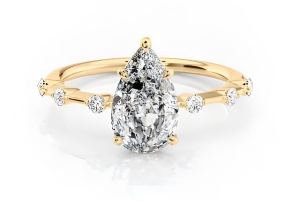 Pear-cut diamonds have a timeless look, with a versatile shape that can be worn facing up or down. In this ring, a pear-cut diamond takes centre stage, with tiny diamonds positioned along the band to give it a bubble look. This ring would work in any metal.