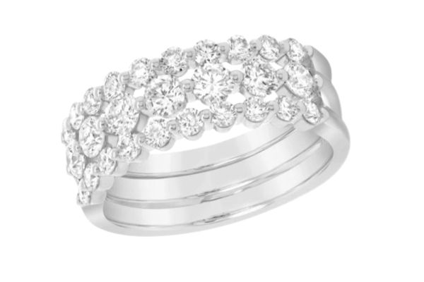 These rings are perfect for multi-layered styles, especially when stacked with your wedding ring. Layered rings feature a series of small diamonds set along the top of the band, with plain metal on the underside. In this ring, the centre layer features alternating small and larger diamonds to add to the bubble effect. Layered rings work well if you want to go for a mixed metal design or add coloured diamonds in one of the rows.