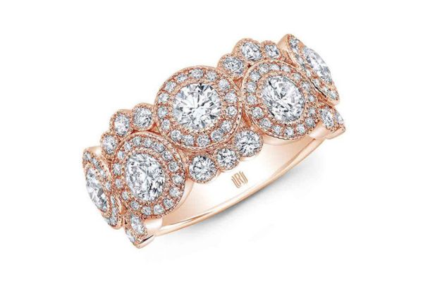 If you’re more into chunky, bold styles, this one is sure to make a statement. A series of round halo diamonds is positioned along the top of the bubble band, interspersed with a series of three diamonds that wrap around the larger stones. The effect is a ring that has plenty of visual detail and lots of sparkle.