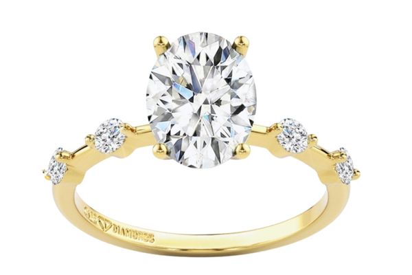 The Star Crossed ring from the Cape Diamonds ring collection gives a sophisticated touch to the classic solitaire design. Small round diamonds are set along a yellow gold band, with an oval diamond in the centre. This ring has a subtle bubble effect, with spaced-out bubbles rather than an endless series of bubbles. Yellow gold gives it a timeless look, but it would work well in rose gold or platinum.