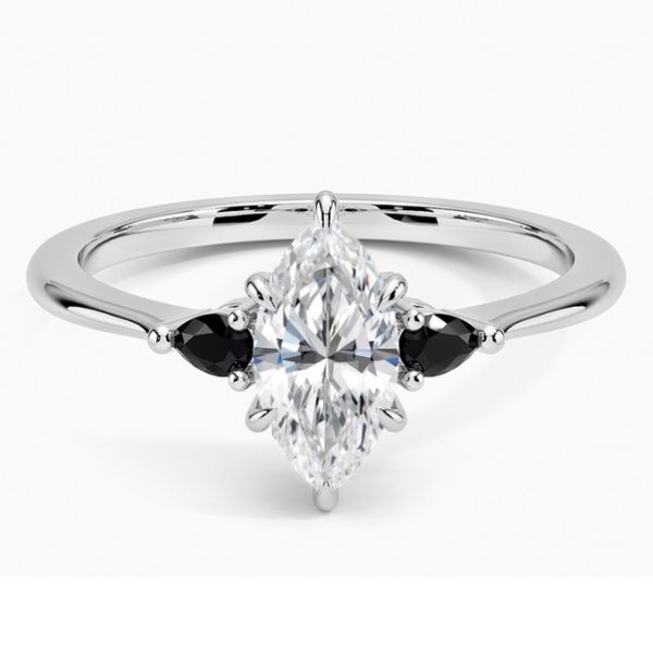 For a minimal, elegant twist on the classic three-stone ring, this design features a centre marquise diamond flanked by two black pear-cut diamonds. The contrast between black and white makes this ring stands out. It remains an understated ring that subtly adds visual detail. Other coloured diamonds or gemstones could be used instead of black diamonds.