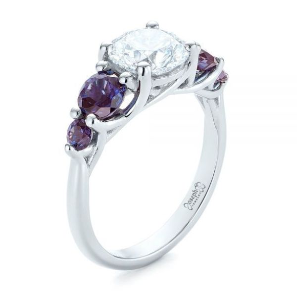 Alexandrite side stones bring deep shades of purple into this ring, while a cool round diamond sits at the centre. The tapered side stones add balance to this design. This design is extremely versatile, working well with any type of stone, shape and metal band. If you’re choosing a five-stone ring, however, the most important thing is to ensure that the centre stone is not overpowered by the side stones.