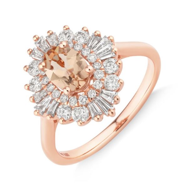 There’s a reason that morganite rings are considered one of the most feminine designs. With their warm rosy colour, these stones are romantic and elegant. They are especially beautiful on rose gold bands. This ring ups the elegance, with a tutu or ballerina design. These designs feature a centre stone that is surrounded by small diamonds – usually a mixture of baguette and round or oval shapes.