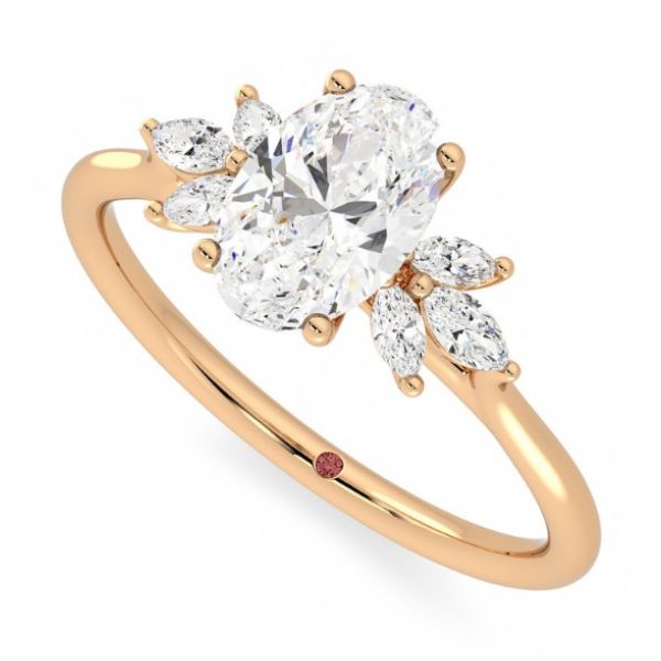 This feminine ring is delicate and pretty. An oval diamond is flanked by small marquise diamonds, forming petals. A delicate gold band adds to the elegance of this ring. You could add more contrast by choosing coloured stones such as pink sapphires or deep green emeralds to enhance the petals.