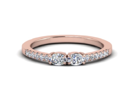 Pear cut stones are another one that works well for east west rings. This adds an unusual touch to the ring that can be made even more interesting by opting for a stone such as morganite instead of a diamond. Tiny pave stones add visual detail. Opt for a cool-toned metal such as white gold or platinum or try rose gold for something warmer.
