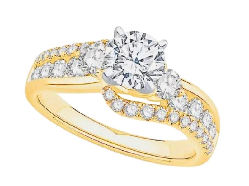 A split band bypasses the main round diamond, flanked by two smaller diamonds on either side of this ring. On the right, the ring has a gold band at the top, with two pavé bands that become a single band as the ring continues under the diamond. On the left, a classic split band leads up to the centre diamond. The result is an eye-catching ring that has a swirl effect and plenty of sparkle.