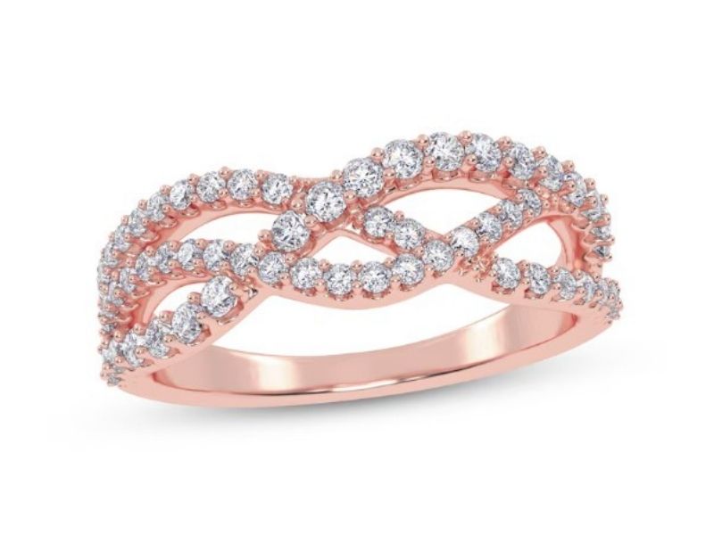 Cross-over rings can be bold or more subtle. In this design, three pavé-encrusted bands cross over to form loops. A fine rose gold band adds a feminine touch. This ring is a good choice for those wanting a ring without a large single diamond. It would work well with coloured diamonds, adding a row of black diamonds to contrast with the white diamonds. Platinum or yellow gold would work for the band, too.