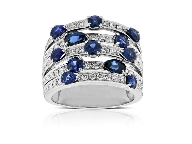 Another bold design, this ring features five pavé rows of deep blue round and pear sapphires clustered along the bands. As a diamond alternative, sapphire is sophisticated and durable, working especially well with cool-tone metals and accent stones such as white diamonds. You could choose a more symmetrical design for the sapphire layout across the bands, or choose a single cut rather than a combination of pear and round stones.