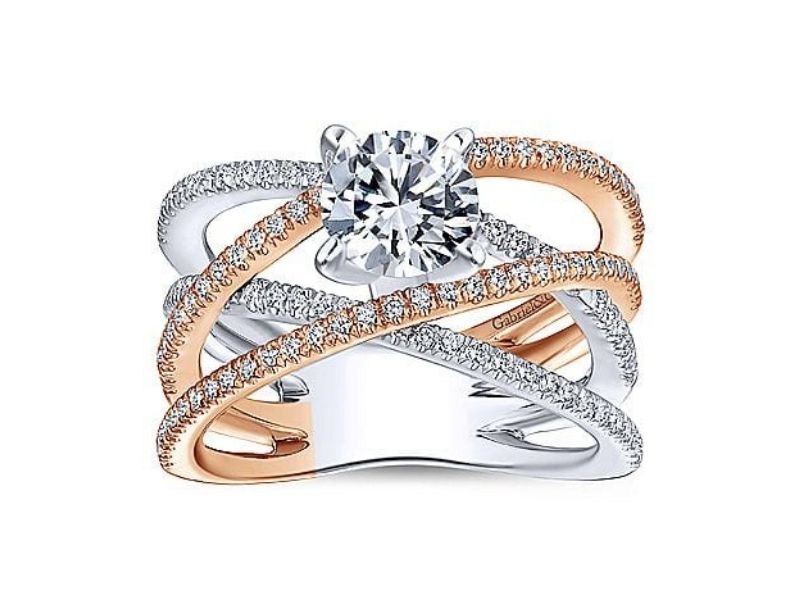 Two-tone rings are a great way to combine metals for a unique look. In this ring, rose gold is mixed with white gold, with three pavé-encrusted bands forming a criss-cross style. In the centre, a round diamond takes centre stage. This ring would work in a single metal or a combination of yellow and white gold.