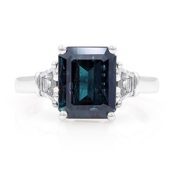 Emerald-cut rings remain one of the most popular styles. These stones have a flat surface, with clear, unobstructed edges. Although this cut does not sparkle as much as brilliant cut stones, it optimises the colour of your chosen stones. With a stone such as alexandrite, this cut reveals the deep blue-green colour perfectly. The small diamonds set on either side add the final touch.
