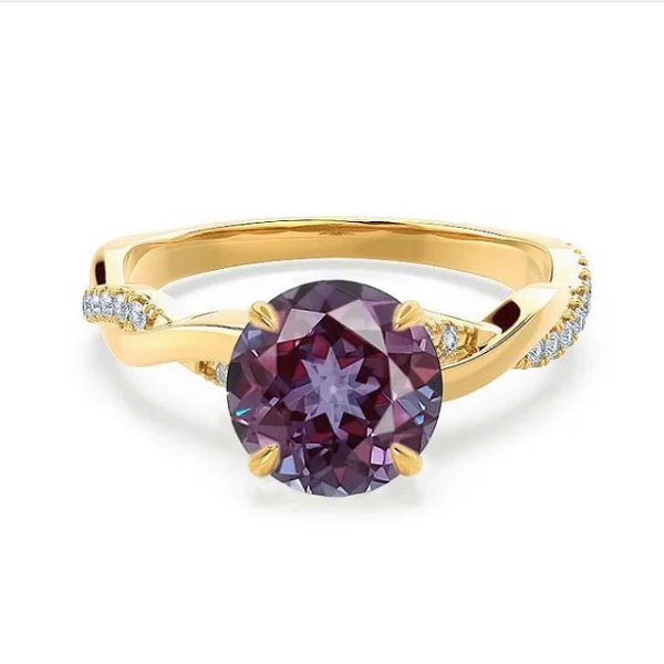 Another popular ring style is the swirled band design. This type of ring has two bands, one with pave diamonds and the other left plain. Unlike double band designs that surround the stone, this design features a solitaire alexandrite and delicate twists. Yellow gold off-sets the purple-blue colour of the centre stone, while the subtle diamonds on the band add more sparkle to the ring.
