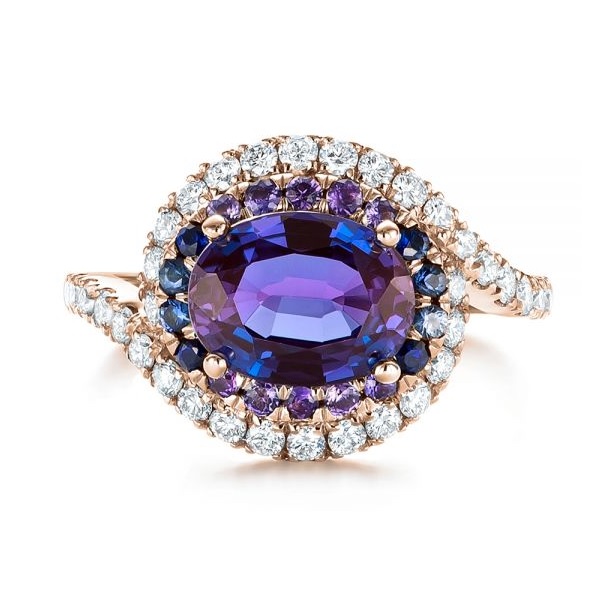 This type of ring features a twisted band encrusted with pave diamonds. The bands meet at the centre, surrounding the stone at the top and bottom. In this design, the centre oval stone takes centre stage. A rose gold band balances out the warm purple colour of the stone.