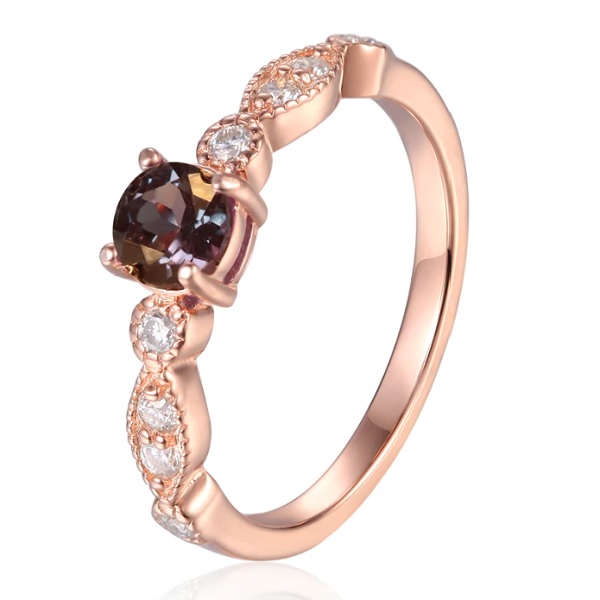 This ring will appeal to those wanting a feminine, minimal ring. Accent stones are featured in designs such as infinity loops. This design has a series of oval diamonds along a rose gold band, with a small round alexandrite in the middle. As the middle stone is fairly small, the diamonds are not overpowered. A rose gold band adds more warmth to the deep maroon colour of this alexandrite stone.