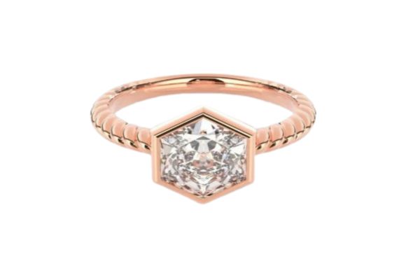 Hexagons and other geometric designs are a must for those who prefer something a little different. These rings may make a bolder statement, but they can still be fairly simple with the right setting. Bezels are a great way to keep the focus on the centre stone. With a delicate rose gold band, the result is a modern, feminine ring.