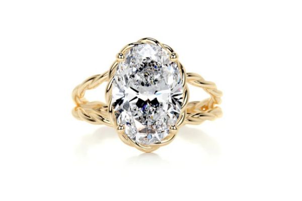Split-band rings are another timeless style, working with plain, pave, and roped bands. In this ring, a yellow gold rope band leads to an oval brilliant cut diamond that delivers maximum sparkle. The result is a ring that has a modern take on a classic favourite.