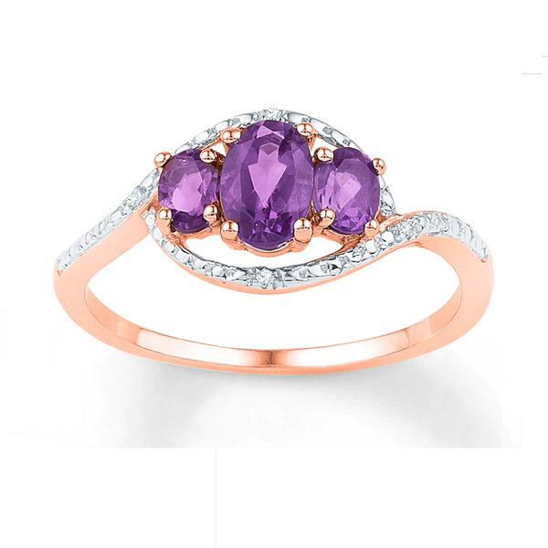 Purple is a surprisingly versatile colour for rings. Depending on the stone, metal and design, this colour can have warm or cool undertones. In this design, a trio of oval amethyst stones take centre stage. A swirl of pave diamonds on a rose gold band creates the perfect balance.
