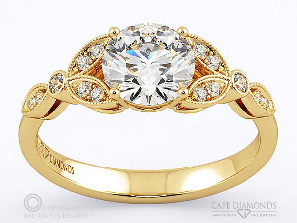 In the Cape Diamonds Organic Elements Ring Collection, we have a beautiful twisted leaf ring. A single round diamond is flanked by bezel-set marquise and round diamonds that are positioned along the band to meet the centre stone. This ring works well in any metal – especially warmer tones such as yellow or rose gold.