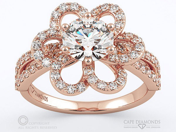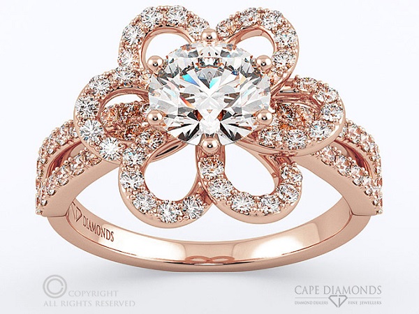 The Cape Diamonds Grand Petal Halo Ring is bold and beautiful. This flower ring has pave-encrusted petals set on a rose gold split band. A single round diamond is placed in the centre. Although round diamonds work well in this ring, oval or even square diamonds would work equally well. Rose gold is the ideal metal for this ring, adding a warm, rosy touch.