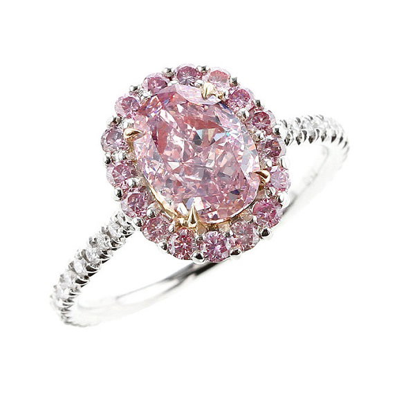 Pink diamonds or sapphires add colour to your ring, working well when set alongside diamonds. This ring features a classic halo design with a twist. The delicate pave-encrusted band leads up to the centre pink diamond, which is surrounded by a halo of pink-purple diamonds.