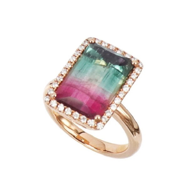 Watermelon tourmalines have a unique blend of colours, blending green and pinkish purple together. These rings bring to mind warm spring days, as the countdown to summer finally begins. This stone works with diamonds and pairs well with any type of metal.