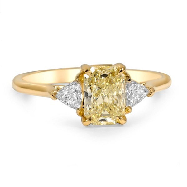 Trilogy or three-stone rings remain a classic choice. These deeply romantic rings symbolise your past, present and future as a couple. In this ring, a yellow diamond is positioned in the centre, representing your present. Smaller diamonds are positioned on each side of the coloured diamond in the centre. A yellow gold finishes off the ring, giving it a bright, sunny look.