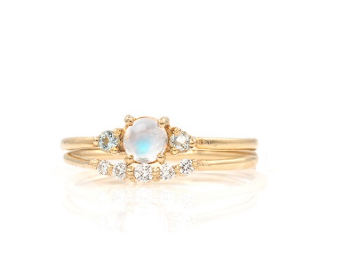 Ring sets are a great choice if you are love to layer your jewellery. You could pair a matching wedding band with your primary ring, adding detail in the form of tiny stones, pave or shape. The contrast of gold, diamond and moonstone work well in this design but it would work well in a cooler toned metal or rose gold, too.