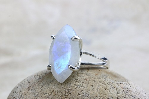 This dramatic ring features a marquise cut moonstone, set on a simple split band. The larger size of this ring is sure to be ideal for those favouring stand-out jewellery. Smaller sized stones can also be used for a more subtle style. You could also add profile detail or change up the band metal.