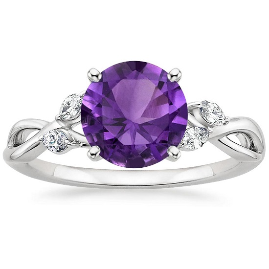 There’s a reason that amethyst rings are popular. This stone has a wide range of purple tones. It works well with every metal colour, from platinum to rose gold. It works well in just about every ring style, too. As it is not a precious stone, it can be a more affordable option for rings. Use the stone as a centre stone or add accents to diamond solitaire designs.