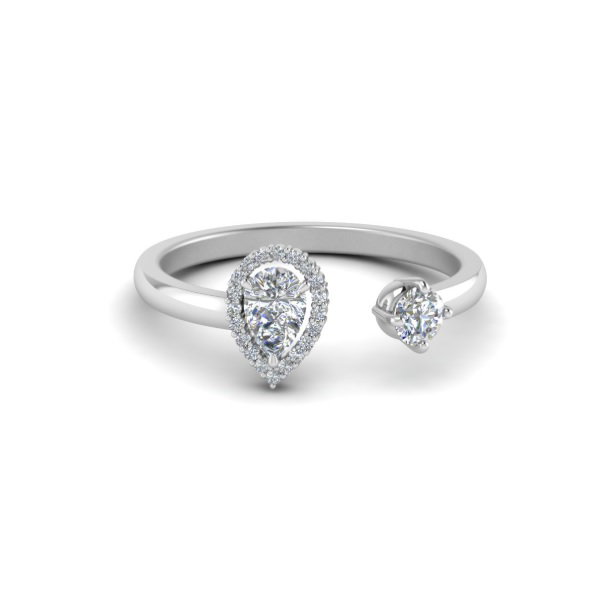 Pear cut rings are timeless and elegant. With a rounded shape that tapers to a point, this cut is also known as a teardrop cut. The unique open shape of this ring enhances the pear cut, adding interest in a subtle way. It would work well in any metal of your choice, with diamonds or any other stone. Pave stones have been used around the pear for added effect.