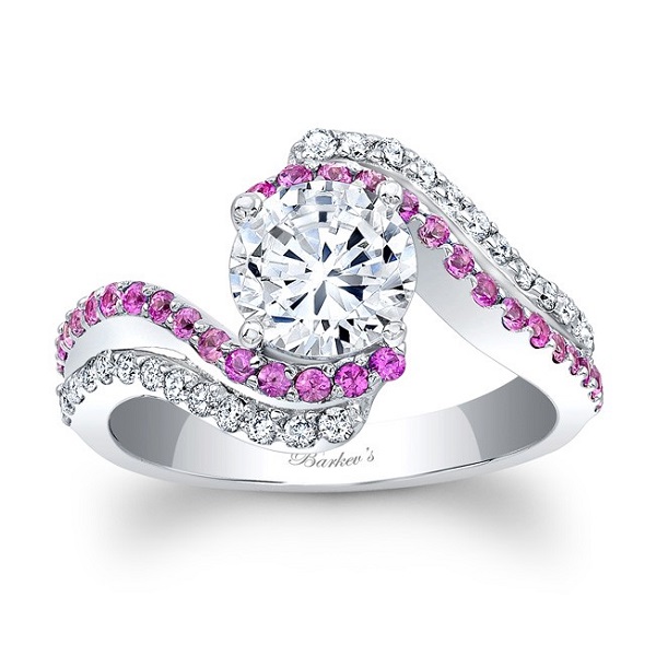 This pink sapphire twist has a more contemporary design. Tiny sapphires are encrusted on a twisting band in platinum or white gold, with white diamonds below and above. The pave twists lead to the centre diamond, adding detail and a hint of colour.