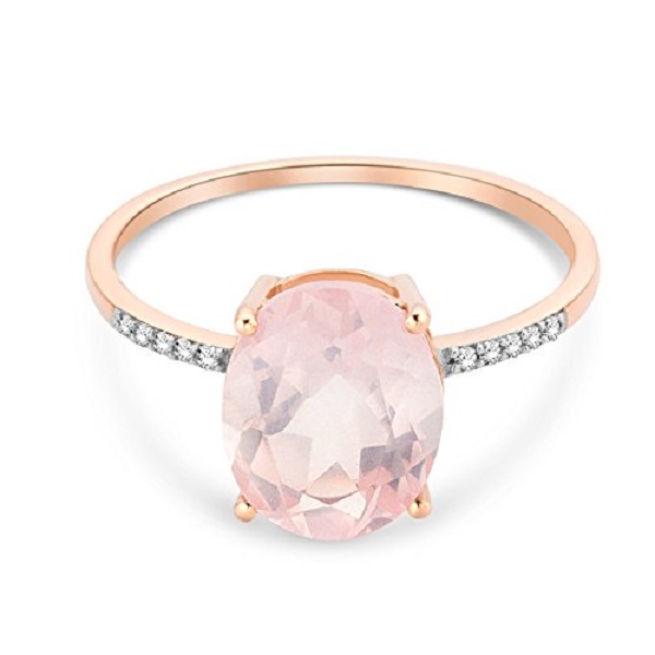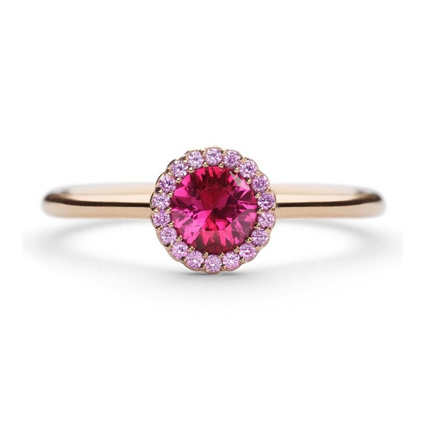 Not all pink stones have to be precious. Semi-precious stones can work equally well if you are looking for something understated and minimal. This rose quartz ring has a simple solitaire setting, a fine gold band, and tiny white diamonds encrusted in its band.