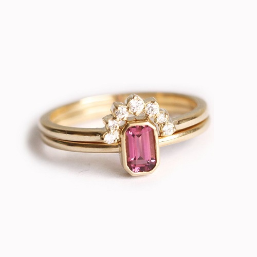 A ring set that combines your engagement and wedding ring (or two rings layered over each other) can create a rather lovely double ring. This style uses a half circle, tiny pave stones and an emerald cut tourmaline, resulting in a layered effect that has a touch of Art Deco glamour. A set like this would work with any colour tourmaline and any metal. The warm tones of rose gold work well with the pink tourmaline shown here.