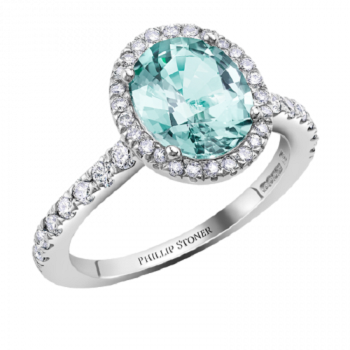 This classic style remains a popular choice for many brides. The bright colour of the aqua tourmaline adds even more impact to the ring, working well with a cool-toned metal such as platinum. Tiny pave diamonds provide extra sparkle, further adding to the beauty of this ring. White gold would also work well with this colour of tourmaline.