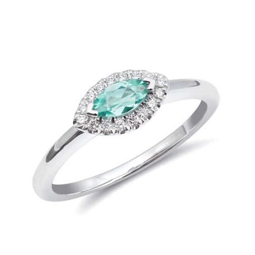 In vibrant aqua, this marquise cut tourmaline is enhanced by tiny pave diamonds and set on a simple platinum band. This style of ring is classic and flattering, and also versatile. Change the colour of the stone, add an extra halo or remove the halo and keep the setting simple or add side stones for emphasis.