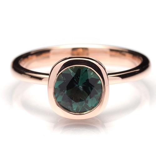 Rose gold acts as the perfect backdrop for a dark green tourmaline that is almost black. The depth of colour in darker toned tourmaline is truly amazing. Although these stones are not known for their clarity, they have a deep, rich level of colour that does not dim or lose any impact. Yellow gold would also work well with this colour.