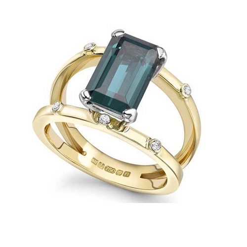 Split band rings are another classic style that will never date. In this ring, a deep green baguette tourmaline is set between two yellow gold bands, with tiny pave diamonds added to each band. This style would work with any colour tourmaline and any metal, with or without the pave stones.