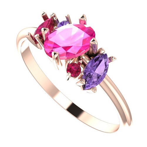 Another good choice for those who prefer something different, this colourful ring is romantic, floral and delightful. Pink and purple sapphires are set on a soft rose gold band in a floral arrangement. You could choose your favourite stones, try coloured diamonds or opt for unusual stones with interesting patterns to further mix things up with this style.