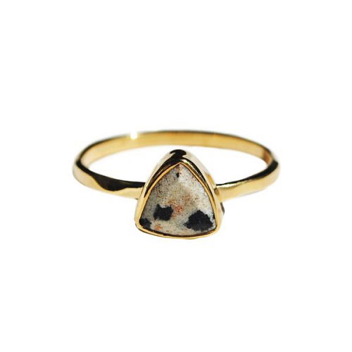 Jasper is a very interesting stone with a Mohs hardness rating of 7 to 7.5 that comes in a wide variety of colours and types. Each Jasper stone is one of a kind, making this an excellent choice for those wanting a ring that truly stands out for all the right reasons. This ring uses a triangle cut in gold, with dalmatian jasper taking centre stage. It would also work well in any other metal and in other jasper stones such as ocean, fancy, green, red, or brown.