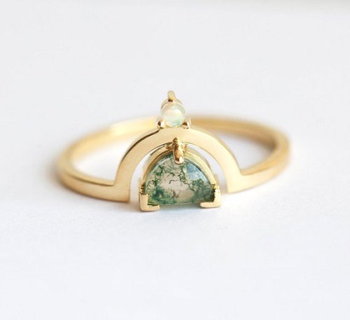 This ring is unusual on many levels. The crescent design adds a touch of drama that works well with the moss agate. This interesting stone offers lots of drama, setting off the gold of the setting and creating a ring that is sure to stand out anywhere. This style could also work in any other metal and stone, too.