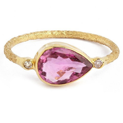 Tourmaline rings offer a great alternative for those who are not too keen on diamonds. Those stones come in a variety of bold colours and styles. A deep pink tourmaline stone sets perfectly against a twisted gold band, offering a fresh, fun ring that is certainly not too traditional or boring! Tiny pave diamonds add the final touch.