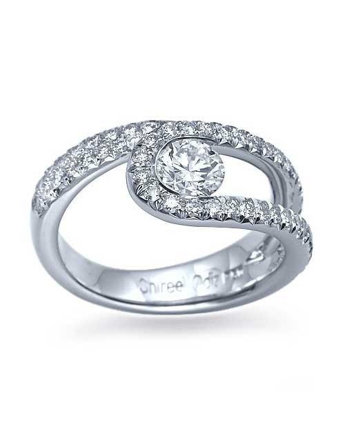 The twisting design of this ring brings out the pave stones to perfection, giving you a sparkly, classic ring that will never go out of fashion. It works very well in platinum, with the cool tone of the metal off-setting the diamonds perfectly. You could also add in some colour in the centre stone, choosing a ruby, emerald, tanzanite or something more unusual, like an opal.
