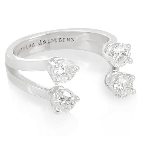 The design of this ring allows you to choose smaller tones rather than a bigger, pricier stone. Each of the four stones is carefully positioned to hug your finger, adding subtle sparkle. The white gold metal of the ring helps to maintain its subtle appeal, but it would also work well in rose or yellow gold as well, or even platinum.