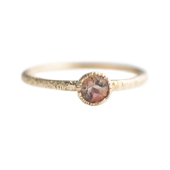 Delicate, fine, and oh-so-gorgeous, this bezel set ring features a textured gold band and a small centre sunstone. Although the texture of the band adds to its unusual design, a simple yellow gold, rose gold, white gold, or platinum band would have the same effect. Bezel cut rings are a good choice for softer stones like sunstone as they do not catch on fabrics and have less chance of stones loosening.