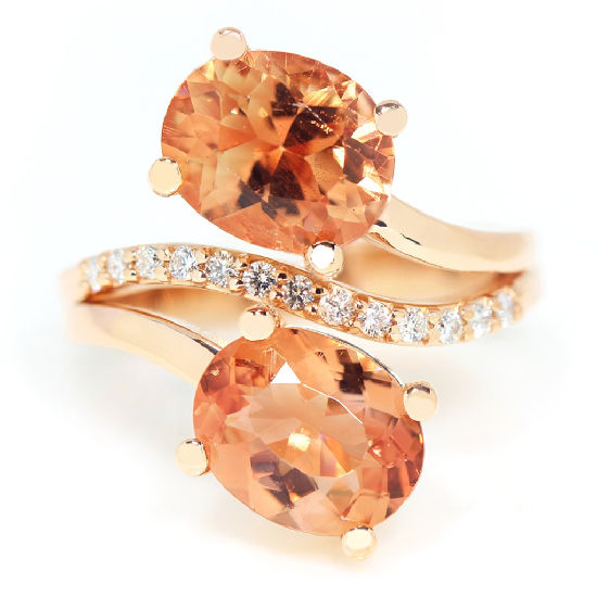 There is certainly nothing subtle about this ring. If you’re looking for a bold, statement ring that is completely unique, this one’s for you. Two oval, deep orange sunstones are set in a yellow gold band, with a twisted pave band twisting between the two stones. The result is a vibrant, warm ring that has maximum sparkle.