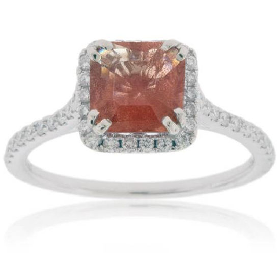 Princess cut rings are another classic that will not be going out of fashion any time soon. This traditional design has a centre sunstone with a halo and pave diamonds that continue onto the band. Platinum is a great choice for this timeless ring, however, it would work equally well with rose gold or white gold.