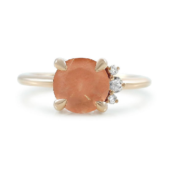 Asymmetrical rings are ideal for brides looking for something unconventional that is not over the top. The subtleness of this ring ensures that it is minimal and simple. The centre sunstone is flanked by tiny diamonds to one side. The balance makes this ring beautiful and feminine.