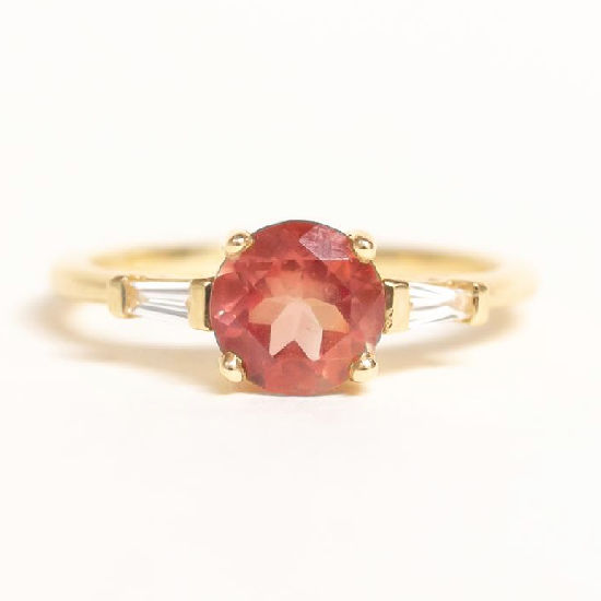 Finally, we have a gorgeous three stone ring. These rings are symbolic, romantic and full of meaning. Each stone represents your past, present and future. With the vibrant coral coloured sunstone in the centre representing your present and the baguette cut diamonds reflecting your past and future, this ring is a must for those looking for a romantic yet modern ring.