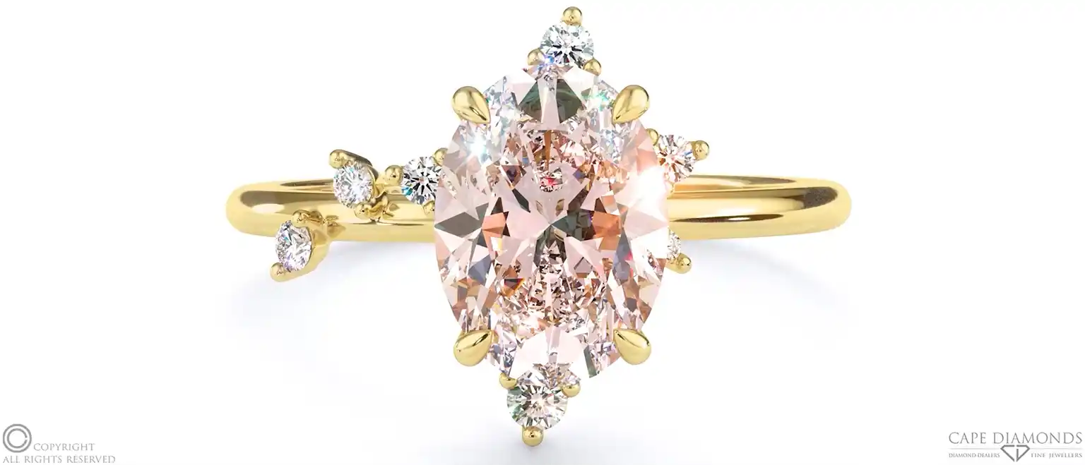 Our collection of trending engagement rings brings you all the latest 2023 designs of the world to Cape Town! The glowing yellow gold engagement rings, adorned with the light pink morganite gemstone, encapsulates contemporary elegance and style. These designs, crafted to embrace modern tastes, fuse the radiant allure of yellow gold with the gentle, peachy-pink tones of morganite, presenting a captivating union of sophistication and current trends. The sleek and innovative settings coupled with the soft, romantic hues of morganite create a captivating contrast, making these engagement rings a statement of refined taste and fashionable allure.