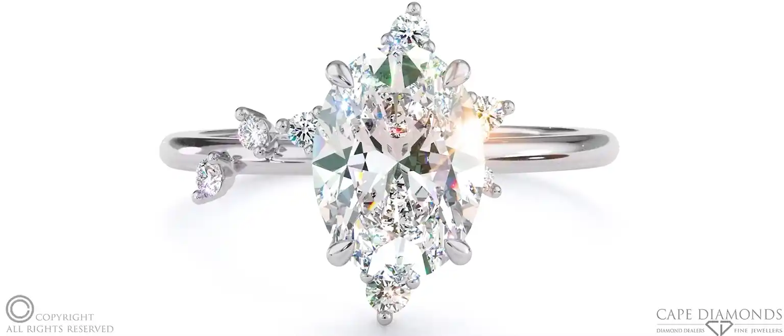 If you find yourself in Cape Town, Durban, or Johannesburg, you’ll fall in love with our locally mined, South African platinum side stones engagement rings. Accentuating your choice of centre stone with a diamond studded, high quality platinum band can make your engagement ring appear to shimmer from every direction. Browse our captivating collection and elevate your proposal with exquisite pavé side stones, channel settings, asymmetrical smaller diamonds, or bespoke side stone diamond engagement ring designs.